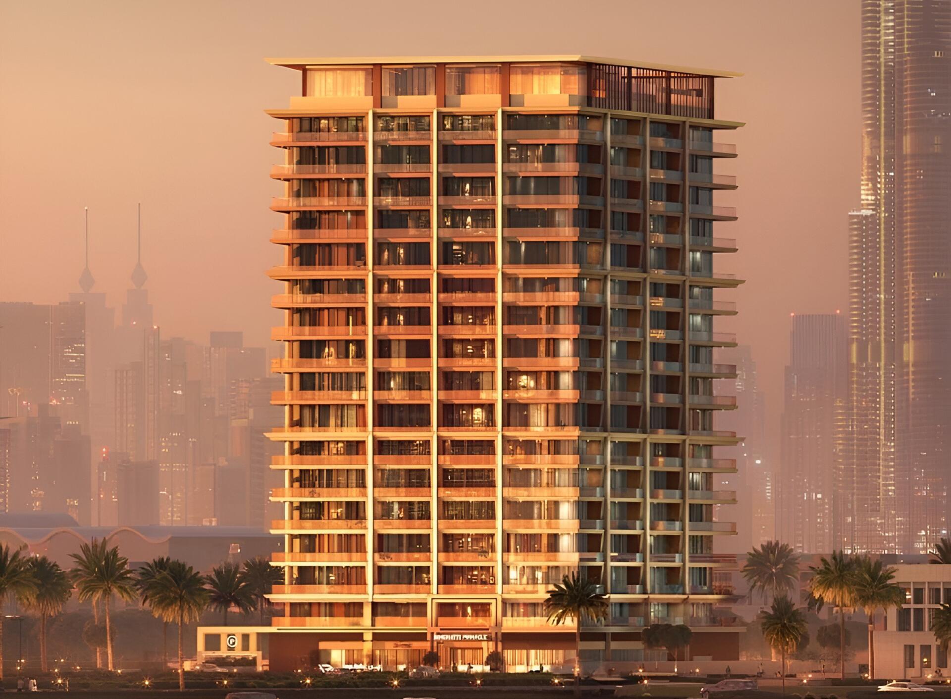 Binghatti Pinnacle is a 28-story residential tower developed by Binghatti Developers, situated in the Al Jaddaf area of Dubai. The building features a modern architectural design that combines elegance and innovation, characterized by a crystalline glass façade and golden accents. The structure includes two basement levels, a ground floor, and three podium levels dedicated to leisure activities.